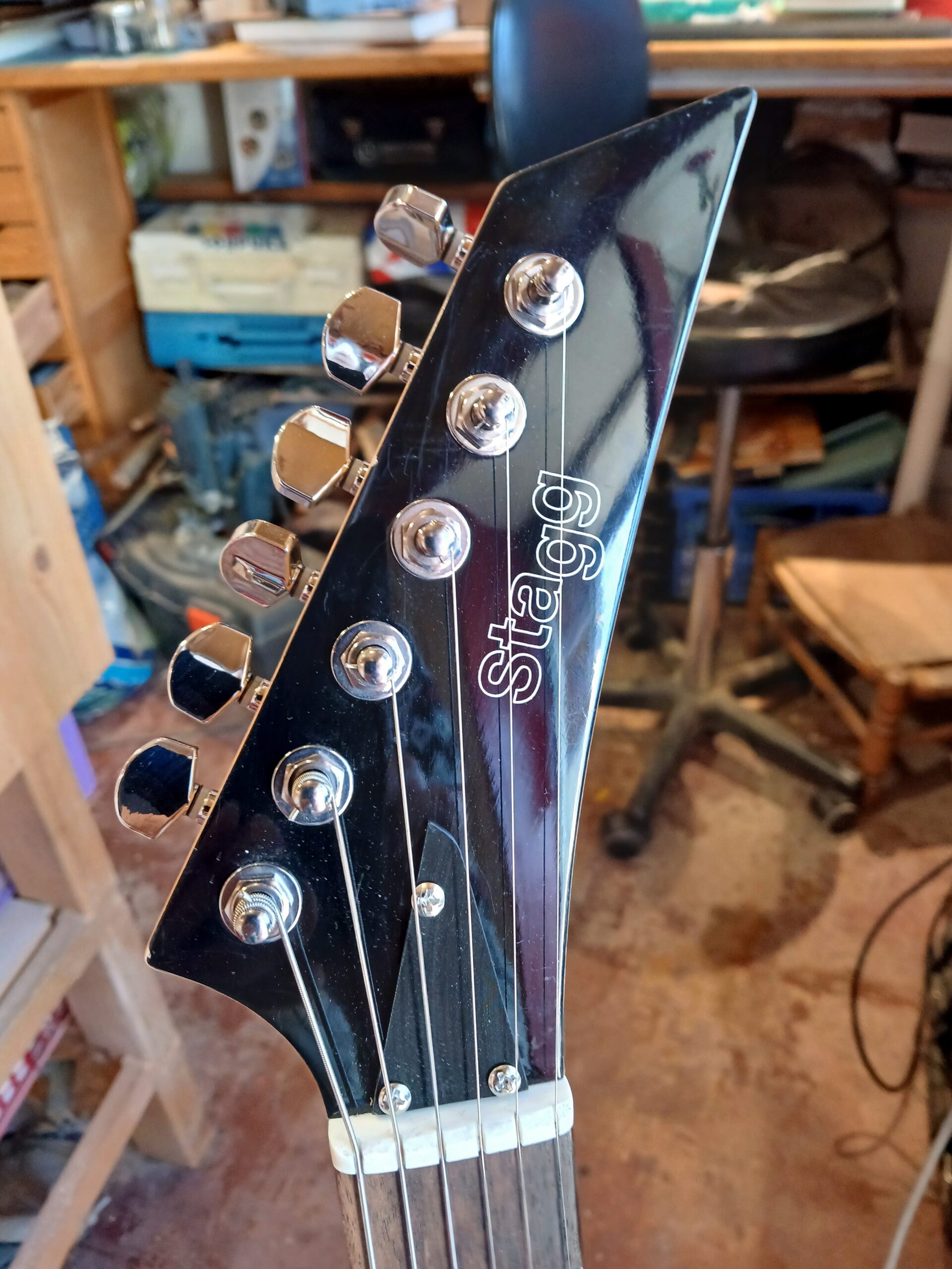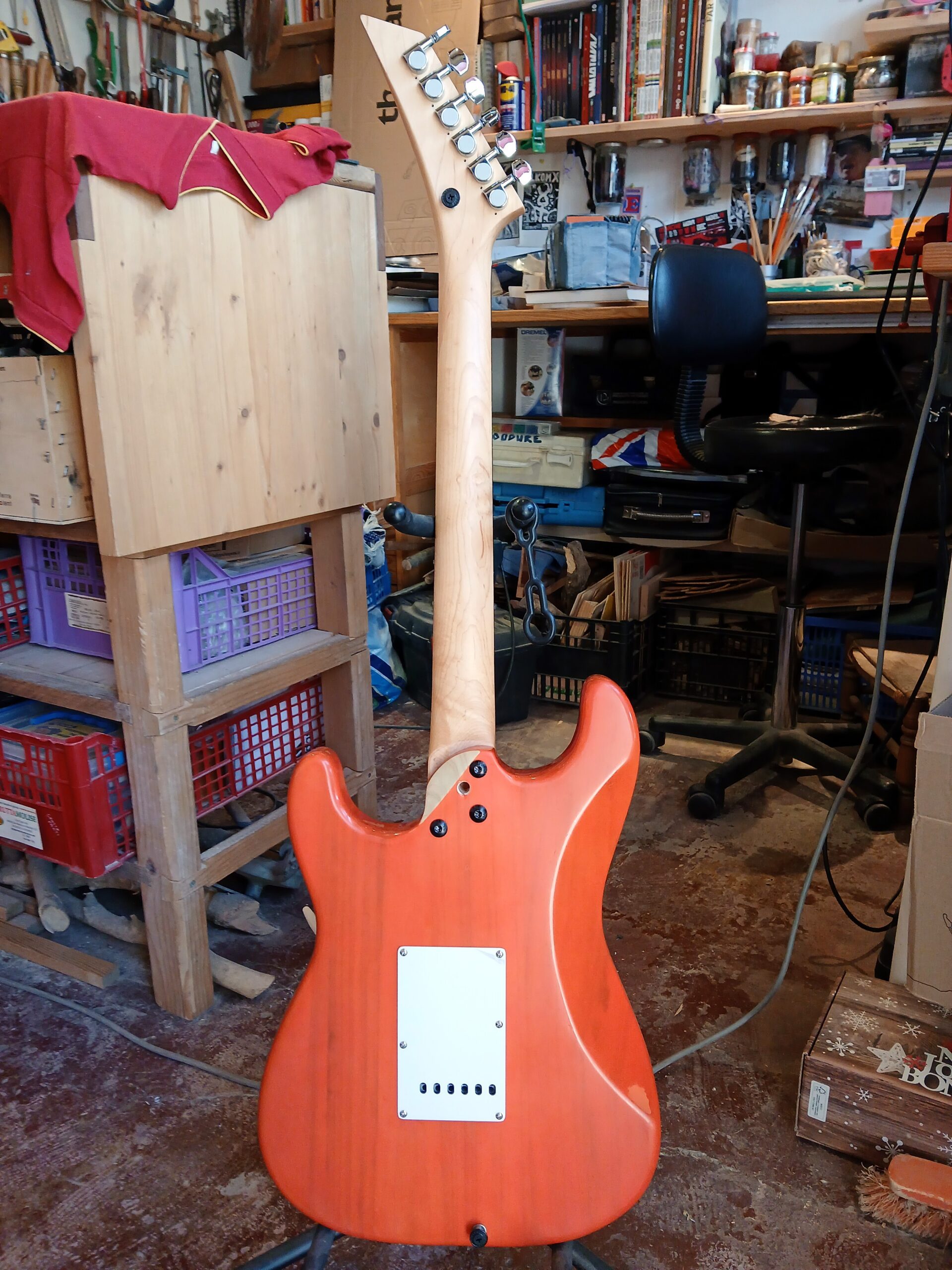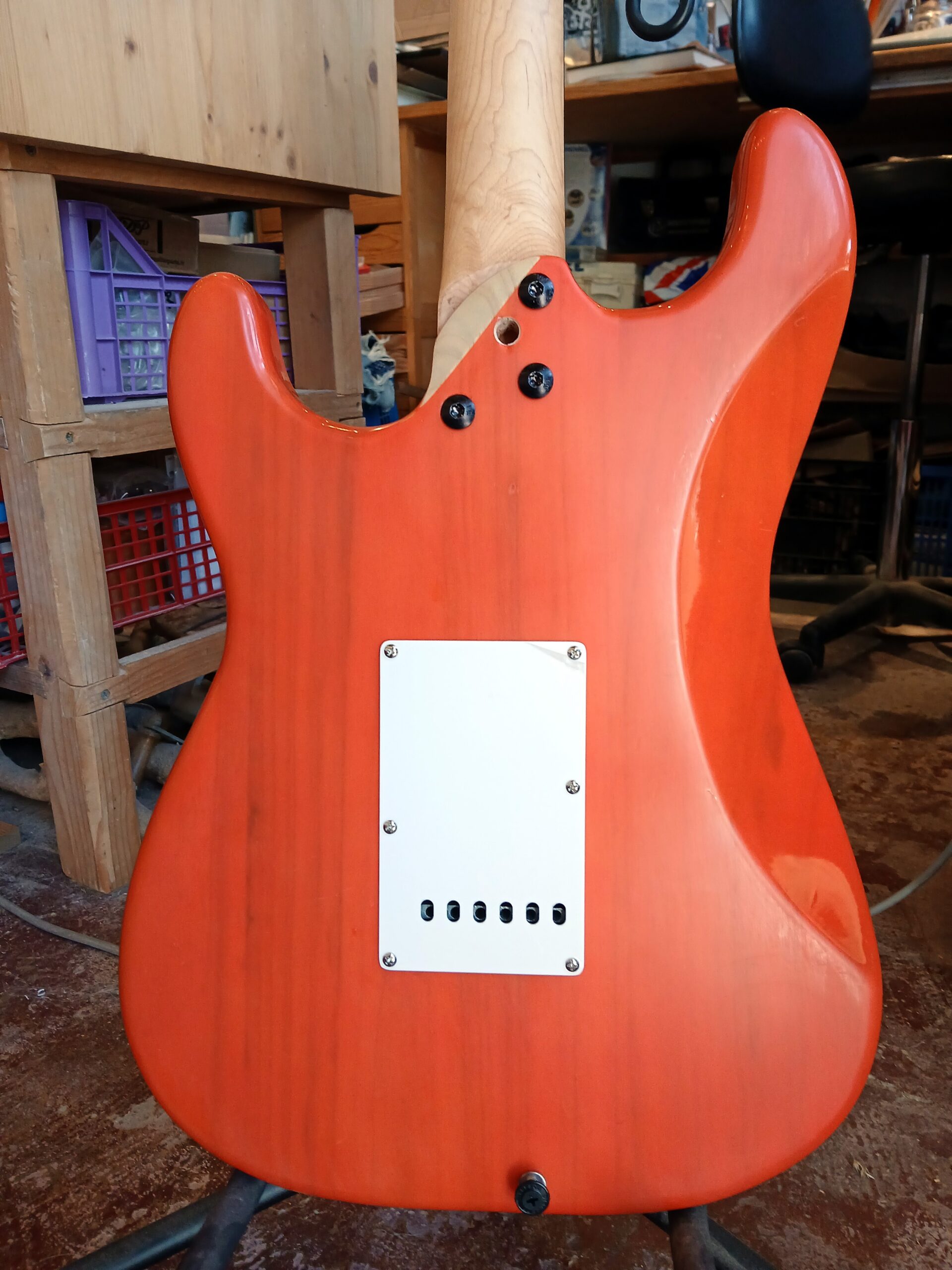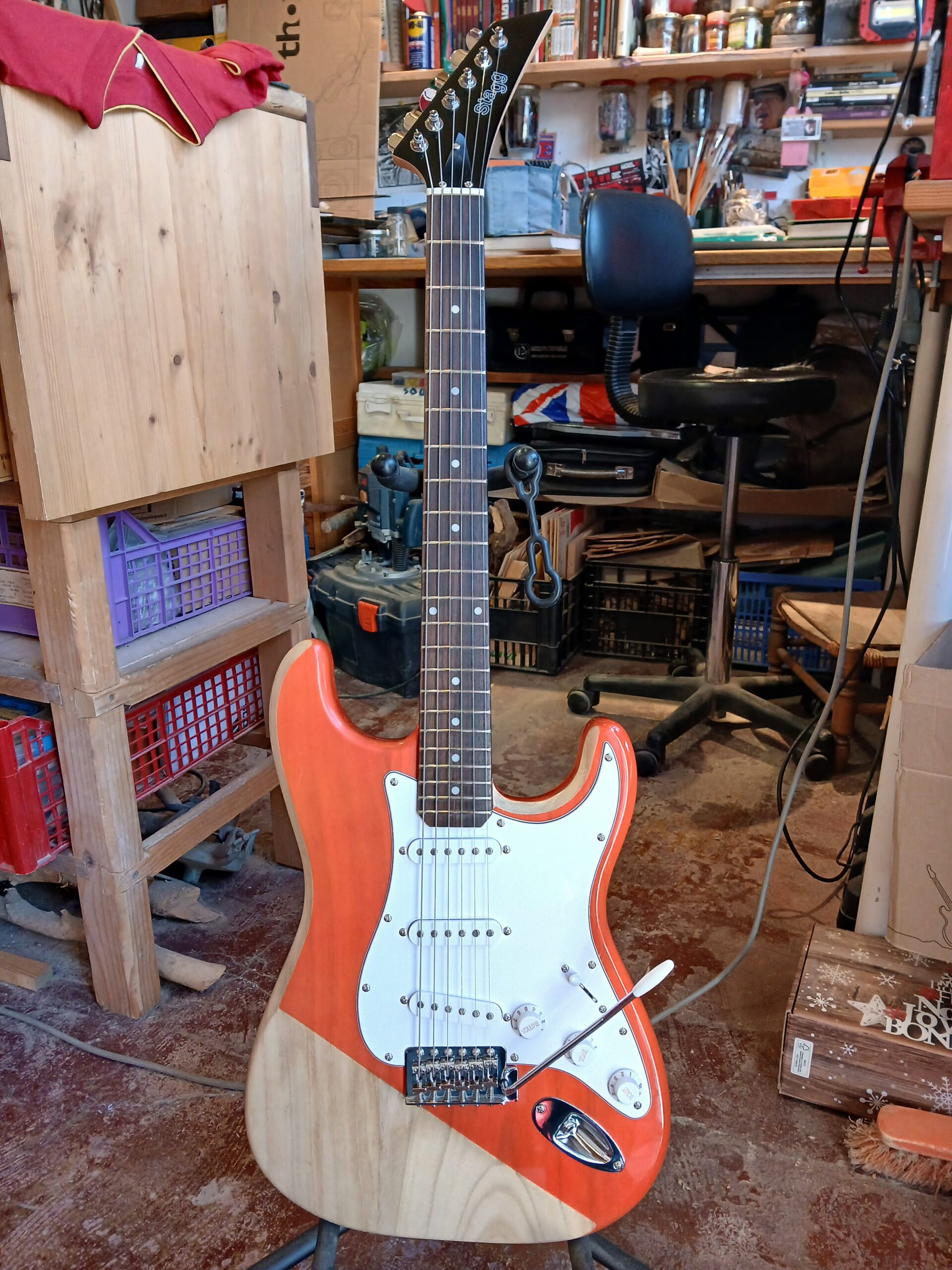 Guitare électrique de type Strat assemblée à l’atelier avec des pièces neuves, dont on peut voir les détails sur le blog, dans l’article « La Battave« .