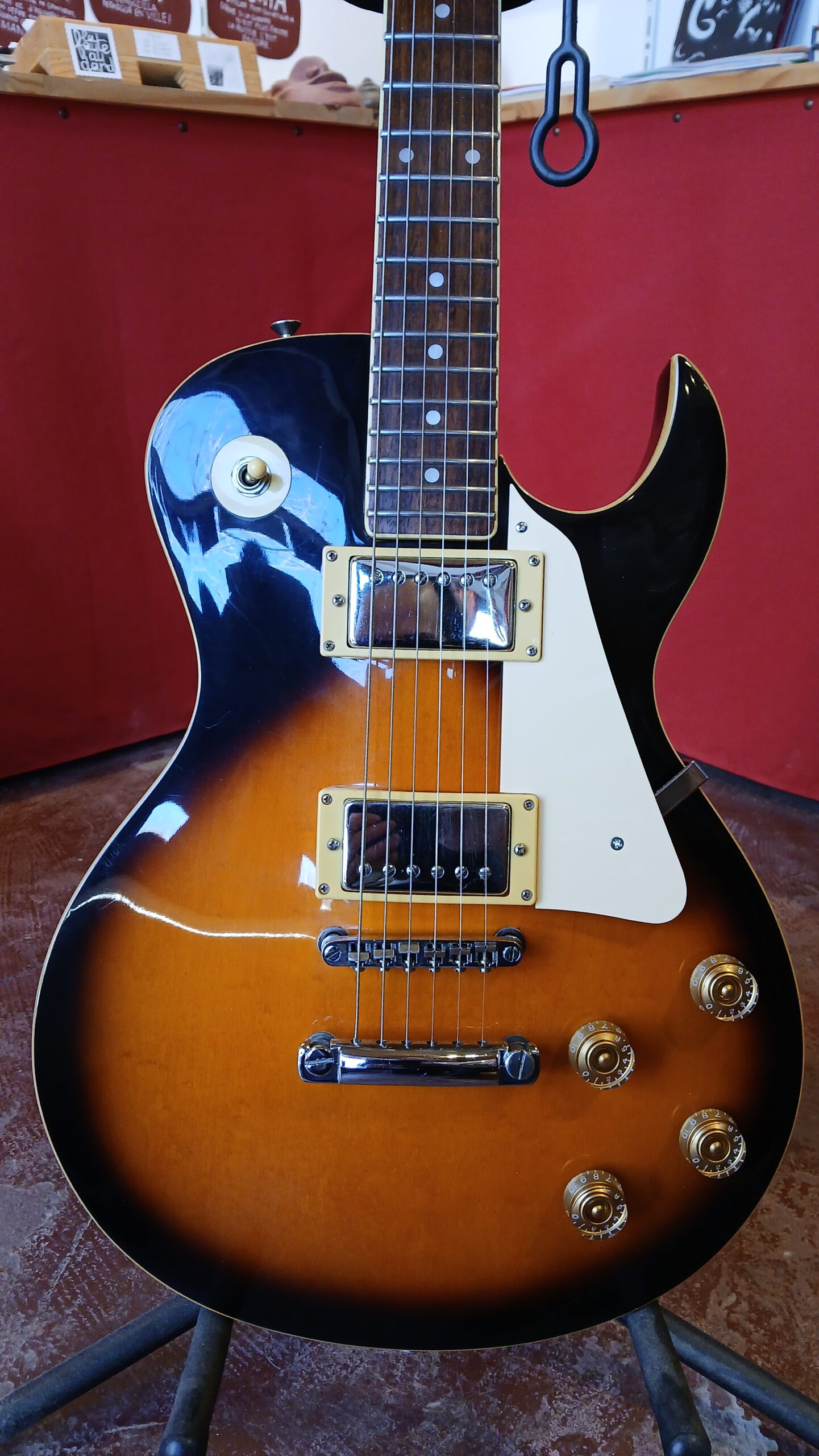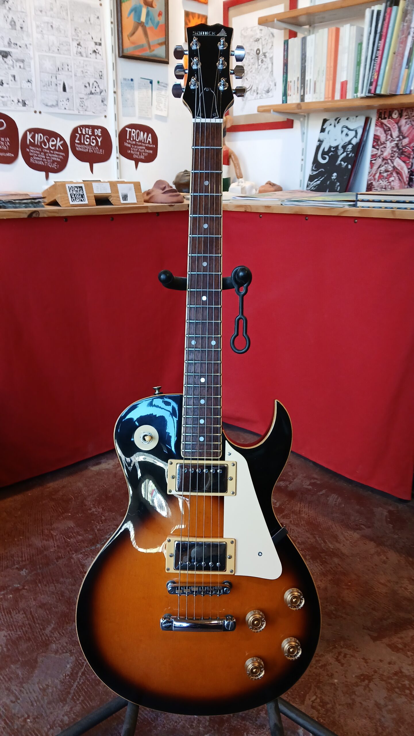 Guitare de type Les Paul, de marque Samick, modèle LSE-450 en Golden Sunburst de 1991, rénovée à L’Atelier L’Art Libre.