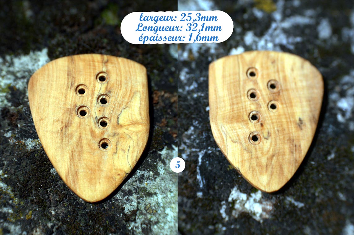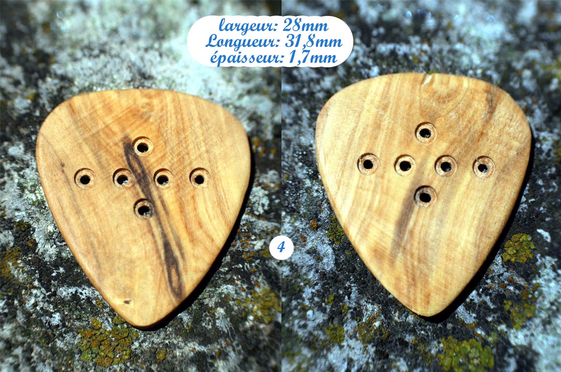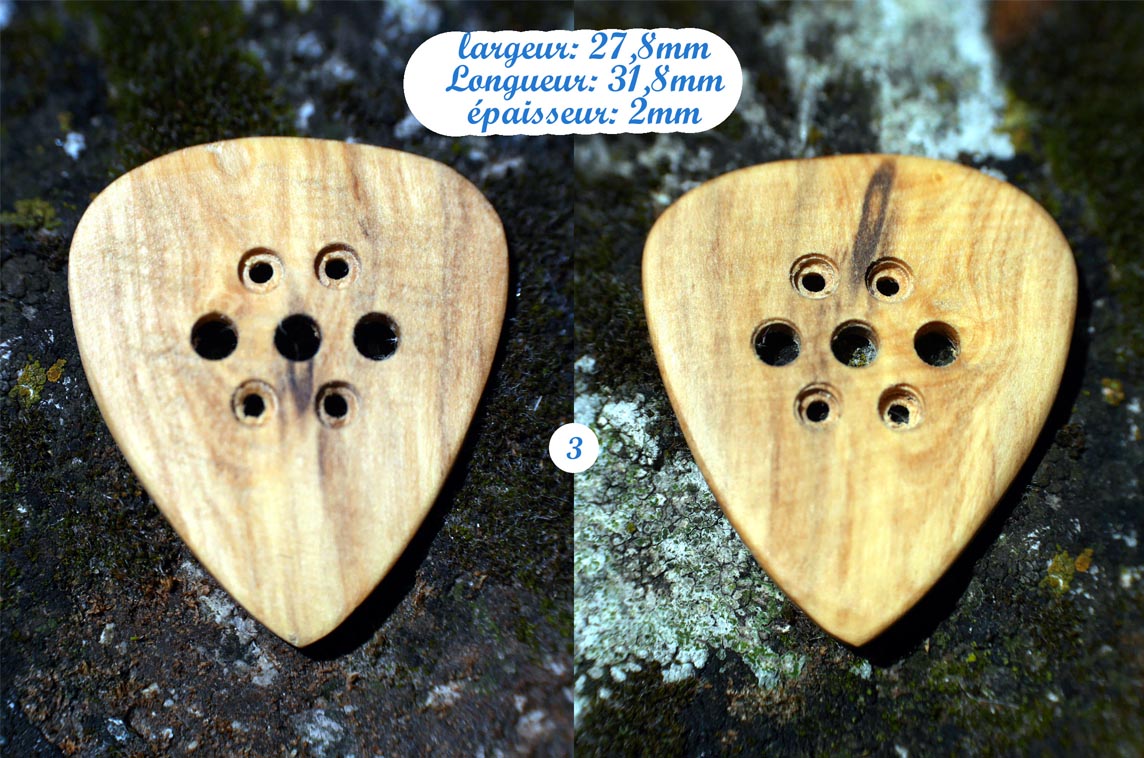 Médiators en buis fait main à L’Atelier L’Art Libre à Forcalquier (France). Traités à l’huile de lin. Dimensions à voir sur les photos. Médiators rigide. Poids: #1 = 1gr / #2 = 0,8gr / #3 = 1,1gr / #4 = 0,6gr / #5 = 1gr